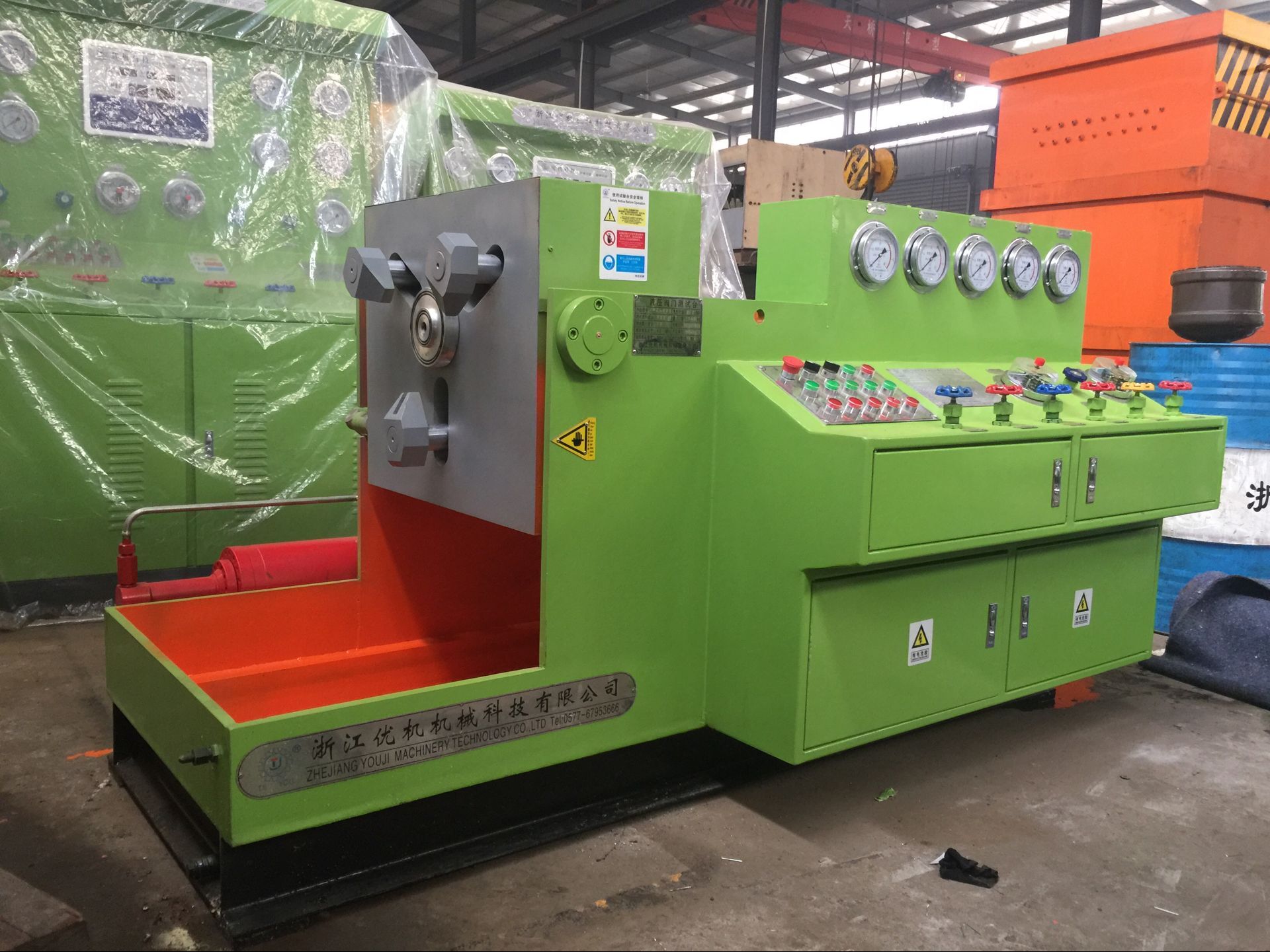 压爪夹紧力所需的高压液压力,由设备本身的液压系统增压而成,试验介质可采用水、煤油或空气。液态介质可循环使用。试验介质的试验压力经增压达到设定的试验压力时,增压自动停止,并自动进入设定的保压计时,保压计时结束后,系统自动发出声光报警,以示测试结束。