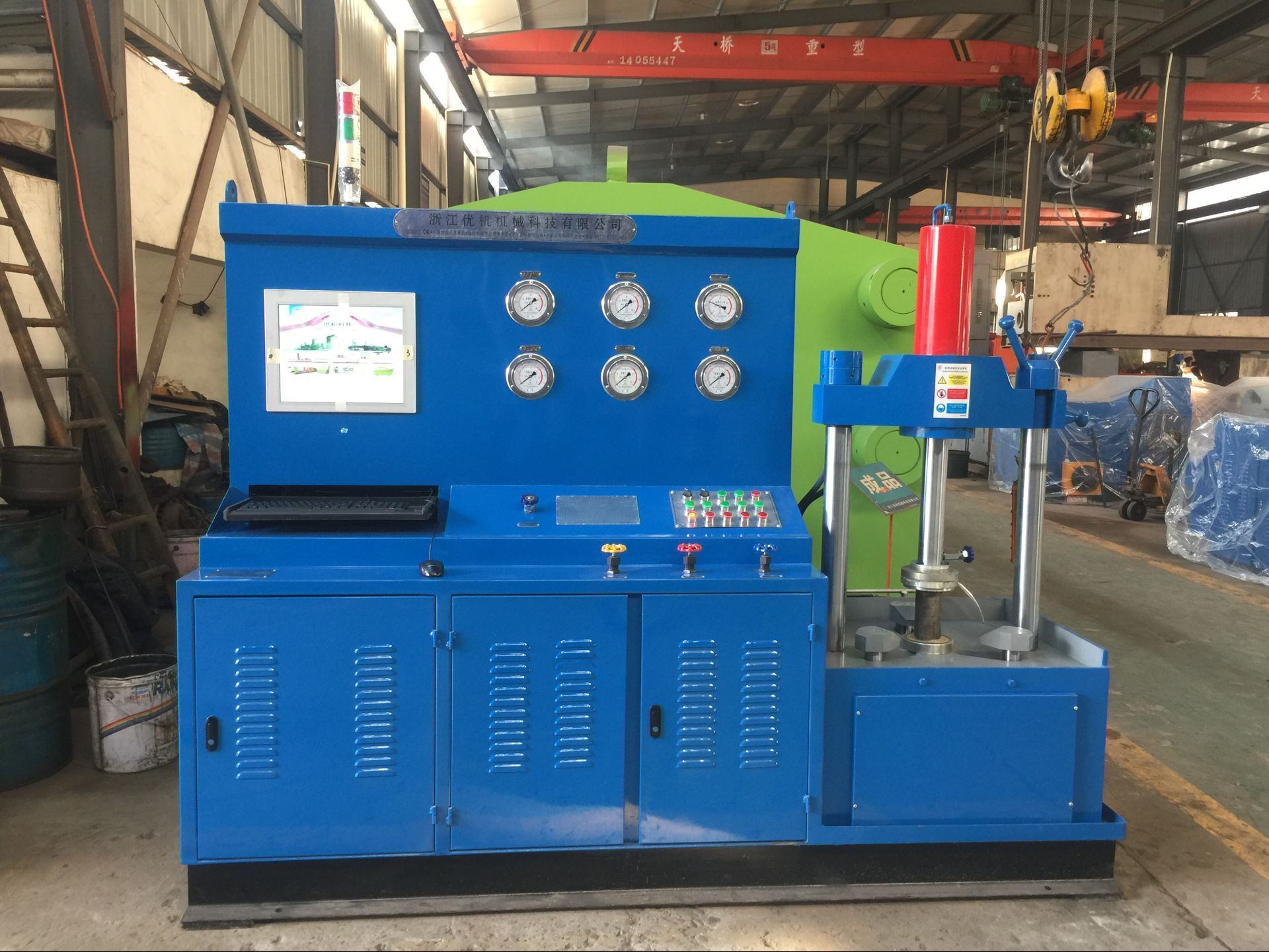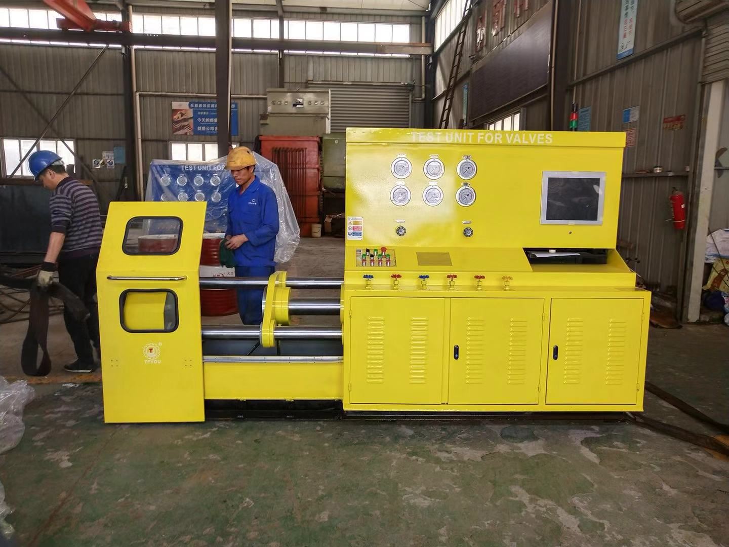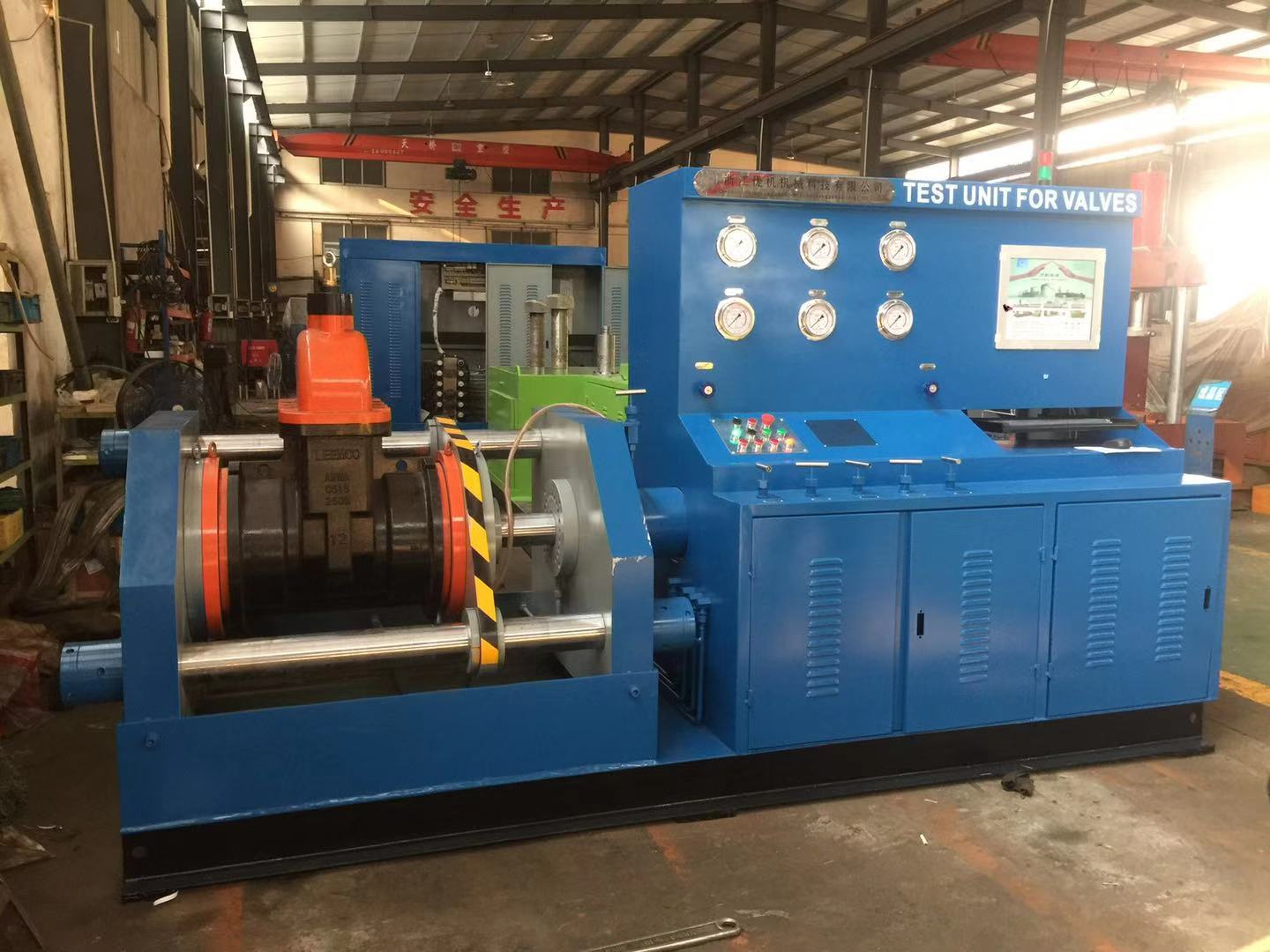 工作过程:根据阀门的公称通径和压力调整油缸压紧压力——压紧工件——打开低水泵快速注水——打开高压水泵——保压计时——卸压、复位。